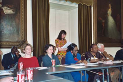 NGO Treffen, Wien 12. Mai 2004 (zum Vergrößern anklicken) (V.l.n.r): Mark Barcouda (im Hintergrund mit Brille), Mag. Barabara Konzet (arbeitet im österr. Verbindungsbüro in Ouagadougou), Dr. Birgit Niessner (Austrian Development Agency), Botschaftssekretärin Fr. Sonja Barthélemy (stehend), Botschaftsangestellte, Botschafterin S.E. Madame Béatrice Damiba, Generalkonsul Dr. Petrus Zehndorfer